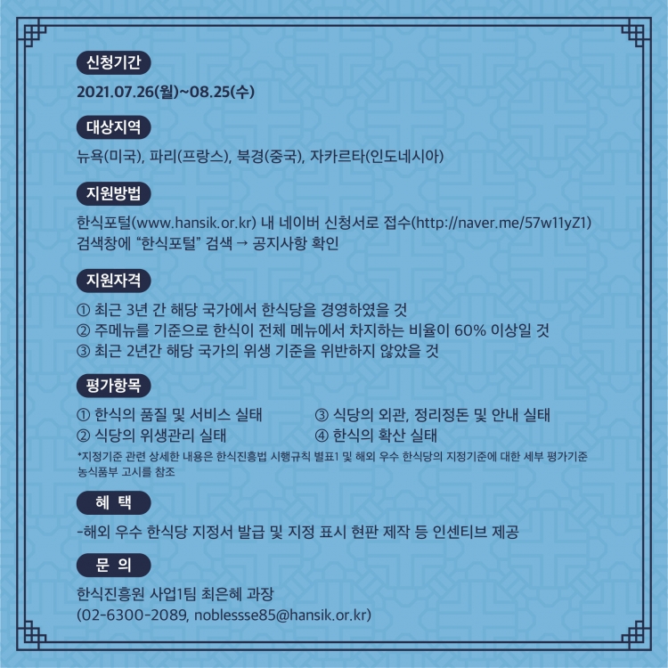 ★ 문의: 한식진흥원 사업1팀 최은혜 과장 (02-6300-2089, noblesse85@hansik.or.kr)