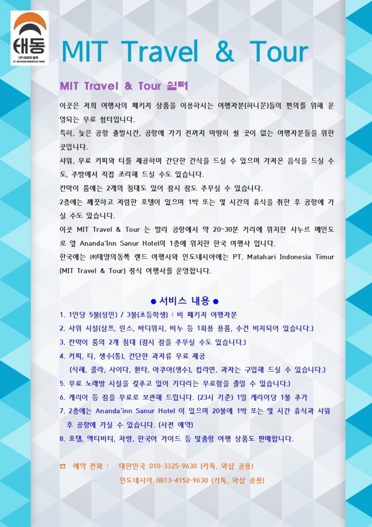 저희 MIT Travel은 저희 여행사 고객분들을 위해 쉼터(라운지)를 운영하게 되었습니다.