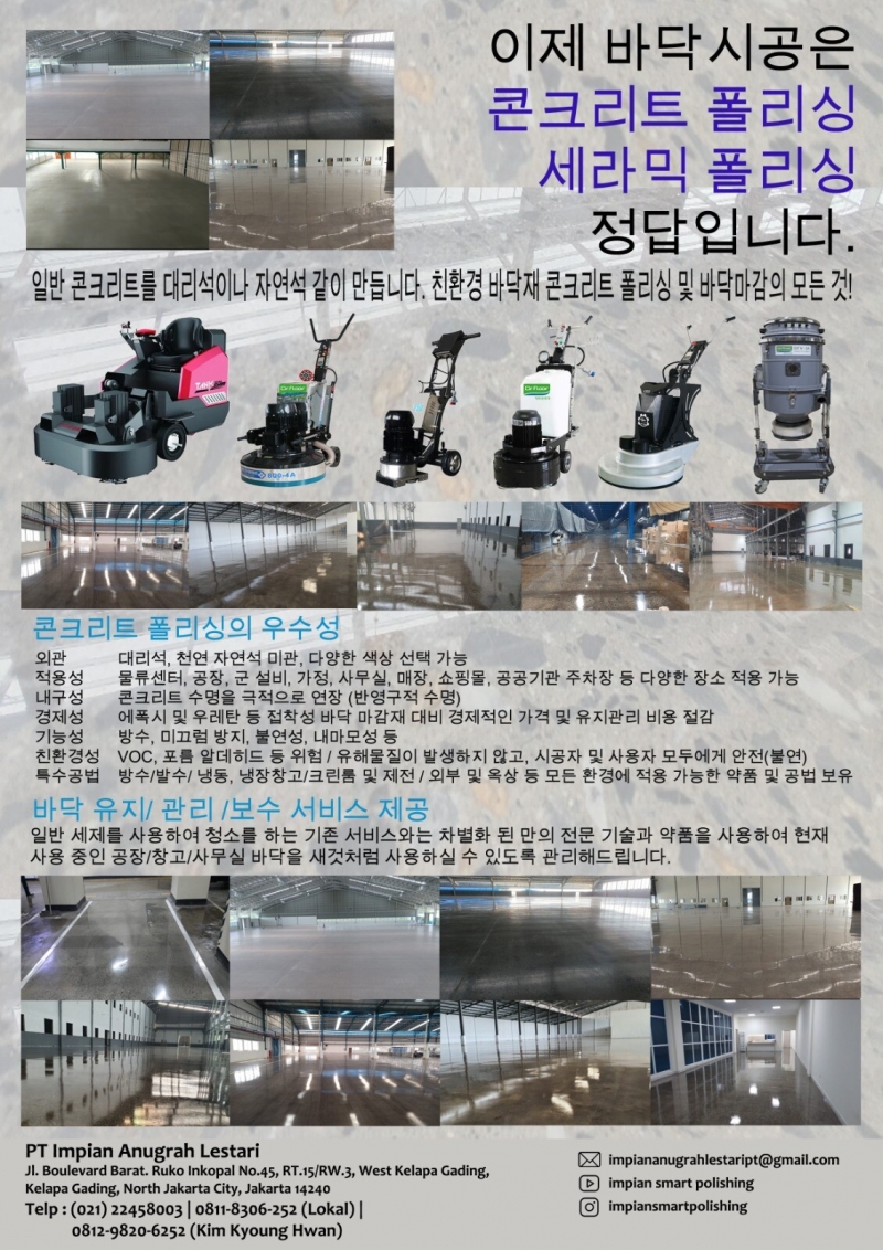 바닥 면처리, 콘크리트 폴리싱, 세라믹 폴리싱 전문업체 PT.IMPIAN 입니다.
