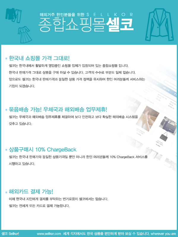 셀코는 한국내 판매가와 동일한 상품가격일 뿐만 아니라 한인 여러분들께 10% ChargeBack 서비스를시행하고 있습니다.