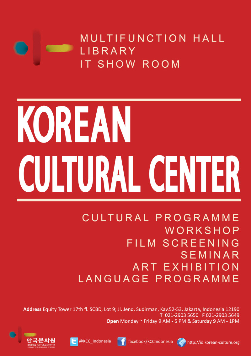 주요기관 | 주인도네시아 한국문화원( Korean Cultural Center) 페이지 정보 작성자 한국문화원 쪽지보내기 메일보내기 자기소개 아이디로 검색 전체게시물 쪽지보내기 메일보내기 자기소개 아이디로 검색 전체게시물 작성일17-02-07 14:32 최종 수정일17-02-07 12:32 조회10,839회 댓글0건 검색 목록 신규등록 게시글 링크복사 : https://www.indoweb.org:443/love/bbs/tb.php/yellowpage/1273 관련링크 021-2903-5650 http://id.korean-culture.org http://114.indoweb.org/kcc kccindonesia@hotmail.com 021-2903-5649 Equity Tower 17th Fl. SCBD, Lot 9, Jl.Jend.Sudirman, Kav.52-53, Jakarta, 12190 본문 한국문화원입니다. Korean Cultural Center 검색 목록 신규등록