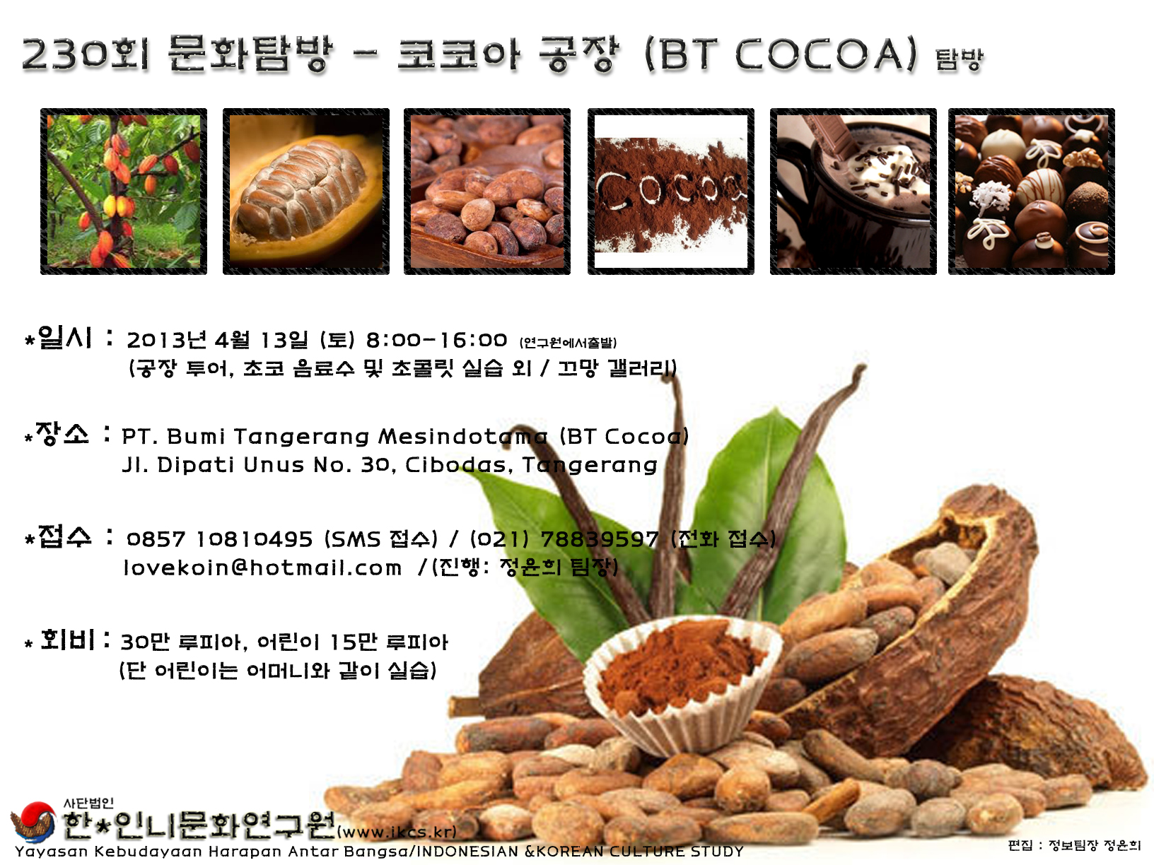 230회 문화탐방 코코아 공장 (BT COCOA) 탐방 일시 : 2013년 4월 13일 (토) 8:00-16:00 (연구원에서 출발) 일정표 : * 09:30-10:30 : 공장 투어 및 초콜릿 영상 관람 * 10:30-12:00 : 초코 음료수 및 초콜릿 실습 * 13:30-14:30 : 점심 식사 * 14:30-17:00 : 끄망 갤러리 투어 장소 : PT. Bumi Tangerang Mesindotama (BT Cocoa) Jl. Dipati Unus No. 30, Cibodas, Tangerang 접수 : 0857 10810495 (SMS 접수) / (021) 78839597 (전화 접수) lovekoin@hotmail.com lilac4004@hanmail.net (진행: 정윤희 팀장)