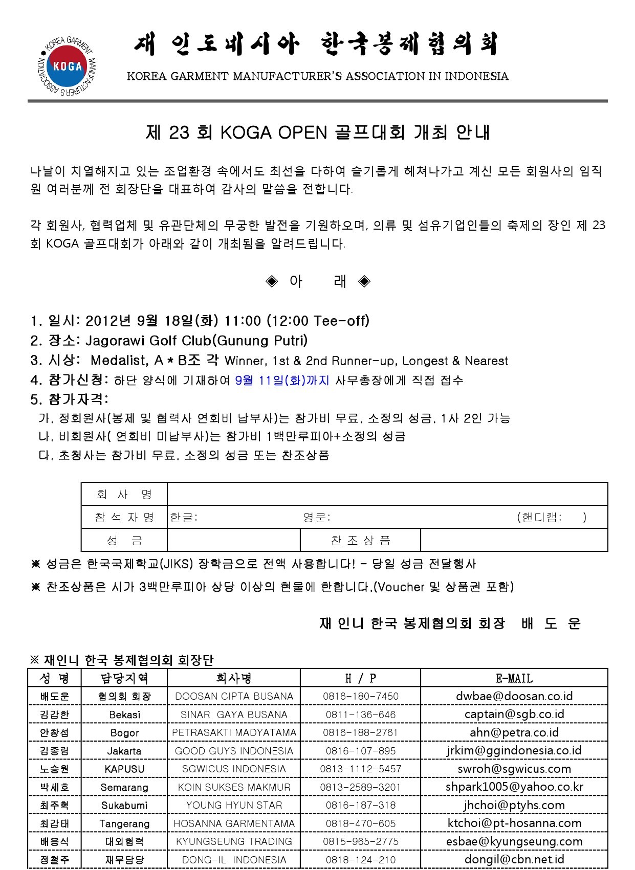 재인도네시아 대한체육회 김희익 사무총장님을 대신하여 글을 올립니다. ~~~~~~~~~~~~~~~~~~~~~~~~~~~~~~~~~~~~ 존경하는 재인도네시아 선수단 여러분. 제93회 전국체육대회 재인도네시아 선수여러분 축하합니다. 여러분은 각 종목별 분과에서 치열한 예선전을 거처 명실상부 인도네시아 대표선수에 선발되셨습니다. 금년 제93회 전국체육대회는 10월 11일부터 10월 17일까지 대구에서 거행됩니다. 올해 인도네시아 선수단은 선수 51명과 임원 49명 총 100명의 선수단으로 구성되어 10월 9일 본진 75명이 장도에 오릅니다. 이번 체전 출전은 100명이 움직이는 큰 행사입니다. 이 큰행사를 진행함에 있어 여러분에게 몇가지 당부의 말씀을 드립니다. 재인도네시아 대한체육회는 순수 민간 봉사 단체입니다. 여러분이 소속된 7개의 분과 부회장님과 이사님 그리고 본부 임원님 모두 물심 양면으로 봉사하는 분들임을 꼭 기억해주시기 바랍니다. 회장님이하 단장님, 부회장님, 이사님 모두 십시일반 여러분의 항공료, 체재비를 준비하여 우리선수단 전원의 모든 경비를 부담하고 계십니다. 혹시 개인적으로 불편한 일이 생긴다면 양보하고 이해해 주시기를 부탁드립니다. 1. 모든 경기 일정은 각 분과 부회장님과 임원님이 직접 진행합니다. 다만 전체가 참석하는 공식 행사에는 어떠한 이유없이 반드시 참석 해야합니다. 개막식, 환영만찬, 폐막식 (폐막식은 경기가 끝난 종목은 참석이 어려울 수 있습니다)에는 반드시 참석 해야합니다. 2. 숙소는 선수 4인 1실입니다. 가능한 분과별로 배정하고자 합니다만 인원이 여의치 아니할 경우 타 분과와 같은 방이 배정될 수 있습니다. 먼저 끝나는 분과의 선수가 퇴실할 때에는 방을 옮겨야하는 불편이 있을 수 있습니다. 양해하시기 바랍니다. 첫날부터 마지막 날까지 방배정은 최석일 이사님이 담당합니다. 3. 아침 식사는 연수원에서 단체로 준비됩니다. 4. 숙소에는 비누와 휴지만 비치되어 있다고 합니다. 개인 세면도구를 준비하시기 바랍니다. 5. 공식적 행사인 개막식, 환영만찬, 폐막식 때에는 단복 정장과 흰색 티셔츠를 착용합니다. 비행기 탑승시에는 땀복을 착용하여 주시기바랍니다. 올 해에는 추리닝은 없습니다. 분과별 경기복은 분과에서 각각 준비하시기바랍니다. 6. 우리는 지성인입니다. 경기장에서나 경기장 밖에서나 품위를 유지하시기를 부탁드립니다. 7. 입국과 귀국 공항은 직접 이동하시기바랍니다. 8. 10월 10일 오전 인천 공항에 도착한 이후 대구까지는 대형버스가 준비되어 있습니다. 7시 30분 곧바로 대구로 출발하기 때문에 인천 공항에서는 별도의 개인 시간이 없습니다. 9. 개별 출발하시는 분은 10월 10일 오전 7시까지 인천공항 입국장으로 오셔서 본진과 합류하시기 바랍니다. 10. 항공권은 10월 2일과 3일 중에 부미관광에서 여러분의 이메일로 전달할 예정입니다. 추후 혹시 빠진 사항은 몇번에 걸쳐 다시 공지하겠습니다. 다시 한 번 제93회 대구 전국체전의 재인도네시아 선수단 여러분을 환영합니다. 감사합니다. 재인도네시아 대한체육회 회장 양 영 연 재인도네시아 선수단 단장 박 동 희 (사무총장 김희익 0811-874-726)