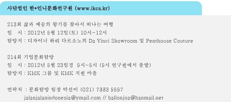 "외국인 친구를 사귈 수 있는 좋은 기회"인도네시아 헤리티지 소사이어티는 대략 600여명의 외국인이 가입되어 있는 단체로 인도네시아의 문화를 연구하고 증진시키려는 목적을 가지고 활동하고 있습니다. 5월10일에 크망빌리지에서 헤리티지의 연간 활동소개 및 발리댄스 공연을 곁들인 행사를 개최합니다. 아무나 참가할 수 있으며 코리안 섹션에서는 사진반 박물관투어 자원 봉사 등의 활동을 하고 있으니 많은 관심과 참가를 바랍니다!일시: 5월 10일 9시반- 11시반장소 : 크망 빌리지 Ritz residence 연락처 0816 1300 210 0815 19024416
