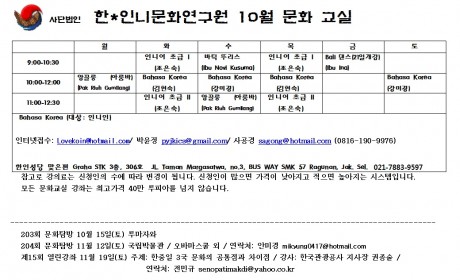 사단법인 한*인니문화연구원 강의 프로그램 2011년 9월 14일 개강 (제1기/ 8회) 월 화 수 목 금 토 9:00-10:30 Bahasa Indonesia untuk Class Dasar (Ibu Kusuma) 인니어 초급 I (조은숙) JKS아카데미 인니어 초급 I (조은숙) JKS아카데미 Bahasa Indonesia untuk Class Dasar ( Ibu Kusuma) 9:00-11:00 tari Jawa (Ibu Martini) Bahasa Korea (김현숙) Bahasa Korea (K-POP) (정승관) Bahasa Korea (김현숙) tari Jawa (Ibu Martini) Bahasa Korea (K-POP) (정승관) 10:00-12:00 Bahasa Korea (김석주) Bahasa Korea (김석주) 11:00-12:30 인니어 초급 2 (조은숙) JKS아카데미 인니어 초급2 (조은숙) 13:00-15:00 Angklung(Arumba,Bamboo Music) (Pak RiuhGumilang) Bahasa Korea (강미경) Angklung(Arumba,Bamboo Music) (Pak RiuhGumilang) Bahasa Korea (강미경) 14:00-16:00 Java Music SITER (Pak Benyamin ) Java Music SITER (Pak Benyamin ) 시창작교실 (이상기) 인터넷접수: Lovekoin@hotmail.com/ 박윤정 pyjkics@gmail.com/ 사공경 sagong@hotmail.com (0816-190-9976),Bahasa Korea(대상:인니인) --------------------------------------------------- 참고로 말씀드리면, tari Jawa 는 자와 지역 전통 춤이고요. Angklung는 흔들어서 한 음계 소리를 내는 악기입니다. 그룹을 지어서 할수 있는 활동이고요. Java Music SITER는 한국의 가야금과 비슷한 것이라네요.. JKS아카데미는 학국 학교 엄마들만의 모임이고요.. 모든 강좌는 신청인원이 5명 이상일 경우에만 강좌를 개설함을 숙지하시고 신청해 주시면 감사 하겠습니다.. 그럼 많은 성원 부탁드립니다. 와양 올림[이 게시물은 wolf님에 의해 2012-01-31 06:42:03 문화/예술/관습/행사에서 이동 됨]