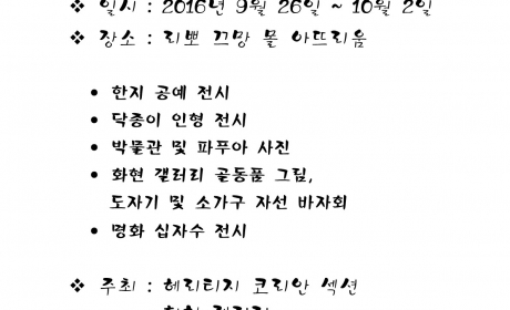 v 일시 : 2016년 9월 26일 ~ 10월 2일 v 장소 : 리뽀 끄망 몰 아뜨리움 • 한지 공예 전시 • 닥종이 인형 전시 • 박물관 및 파푸아 사진 • 화현 갤러리 골동품 그림, 도자기 및 소가구 자선 바자회 • 명화 십자수 전시 v 주최 : 헤리티지 코리안 섹션, 화현 갤러리, 한지 공예가v 후원 : 재인니 한인회, 재인니 한인 문예총