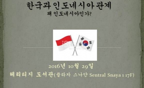 O 일시: 2016년 10월 29일(토) 10시 ~ 12시반 O 장소: 헤리티지 도서관( 플라자 스나얀, 센트랄 스나얀 사뚜 건물17층) * 인니어 강의: 2016년 10월 31일(월)/ 11월 1일(화) UPI 대학과 보고르 빠꾸안 대학교 인니어 강연 인도네시아 역사 책을 집중적으로 집필하신 양승윤교수님을 아십니까? 한국과 인도네시아의 관계상 중요한 가교 역할을 해 온 자랑스런 한국인을 여러분에게 소개합니다.한국과 인도네시아가 외교 관계를 맺은 지도 어느덧 50주년이 지났습니다. 양승윤 교수님을 통해 엄청나게 재미난 인도네시아 이야기를 듣도록 자리를 마련하였습니다. O 신청접수: 인도웹/ 헤리티지 밴드 댓글, leetaria@gmail.com 로 성함과 연락처 남겨주세요. 주관: 한인 문예총 회장 사공경, 헤리티지 코리안 섹션후원: 주인도네시아 대사관, 한국문화원, 재인도네시아 한인회 한인니문화연구원