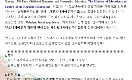한국산업인력공단 인도네시아 EPS센터(센터장 장병현)는 한국에서 일하고자 하는 인도네시아 예비근로자들의 한국어능력시험(EPS-TOPIK)준비를 위하여 “한국어 자가학습용 보조교재”를 인니 해양수산부와 교육부를 통해 산하 어업고등학교 및 대학에 무료로 배포하였다. * 교육부 2,200권, 해양수산부 950권이 보조교재는 약 1년 간 전문가들이 연구, 개발하였으며, 15개 송출국가 언어 중 인도네시아어로 최초로 제작되었다.한편, 지난해 중단되었던 어업직종의 인도네시아 근로자 선발이 올해 재개되고, 한국어능력시험(EPS-TOPIK)은 10월22일과, 23일 양일간 시행될 예정이며, 이번 시험에는 인니 해양수산부, 교육부와 협의하여 어업계고등학교 출신이나 어업 관련 경력자, 안전교육이수자, 자격취득자들이 많이 응시할 수 있도록 홍보하고 있다. 장병현 한국산업인력공단 인도네시아 EPS센터장은 “한국어능력시험(EPS-TOPIK)을 준비하는 인도네시아 수험자들이 혼자서도 한국어능력시험을 대비할 수 있도록 1억여 원의 예산을 들여 보조교재를 제작하고 무료로 배포하게 되었다. 인도네시아는 15개 송출국가 중에서 최초로 보조교재를 배포하는 국가이다. 한국어시험을 준비하는 수험자들은 이 교재를 잘 활용하여 저렴한 비용으로 한국어능력시험(EPS-TOPIK)을 준비할 수 있기를 바란다.”고 말했다.또한 보조교재는 원거리 수험자를 위하여 인도네시아EPS센터 홈페이지(www.hrdkepsid.com) 또는 송출기관 홈페이지(www.bnp2tki.go.id)에서 원하는 사람은 누구나 무료로 파일을 다운로드 받을 수 있다.고용허가제(E-9)를 통해 한국 취업을 희망하는 18세 이상 39세 미만의 인도네시아인은 한국어능력시험(EPS-TOPIK)에 합격해야 한다.한국어능력시험에 합격한 예비근로자는 구직등록 후 사업주의 선택에 의해 근로계약을 체결하고 고용체류기간 3년, 연장계약 1년 10개월의 기간 동안 한국에서 취업활동을 할 수 있다.인도네시아에서는 고용허가제(EPS)를 통해2004년 이후 현재까지 총 7만여명이 한국에 송출되었다. * 문의 : 한국산업인력공단 인도네시아EPS센터 ☎021-7918-6012