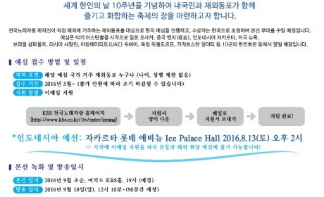 세계 한인의 날 10주년을 기념하여 내국민과 재외동포가 함께 즐기고 화합하는 축제의 장인 <재외동포와 함께 하는 KBS 전국노래자랑 세계대회>가 열릴 예정입니다.전국노래자랑 제작진이 직접 해외에 거주하는 재외동포를 대상으로 현지 예심을 진행하고, 수상자는 한국으로 초청하여 본선 무대를 꾸밀 예정입니다. 예심은 터키 이스탄불을 시작으로 일본 오사카, 중국 옌지(延吉), 인도네시아 자카르타, 미국 뉴욕, 브라질 상파울루, 러시아 사할린, 아랍에미리트(UAE) 두바이, 독일 뒤셀도르프, 카자흐스탄 알마티 등 10곳의 한인회관 등에서 열릴 예정입니다.인도네시아 자카르타 예심은 아래와 같습니다.∙ 예심일: 2016년 8월 13일(토)∙ 장소 : 롯데애비뉴 아이스 팔레스 홀 (http://www.lotteshoppingavenue.co.id/facilities/5/the-ice-palace-concert-hall) ∙ 시간 : 오후 2시~~~~~~~~~~~~~~~~~~~~~~~~~~~~~~~예선접수기준 Q&A 자격 요건은 어떻게 되나요? 해당 예선국가 거주 재외동포는 남녀노소 누구나 참가 가능합니다. (외국인은 대상이 아닙니다.) 주변 국가에 거주하는 사람도 참가 가능한가요? 주변 국가에 거주하시는 분들은 참가 대상이 아닙니다. (아랍에미리트 인근 국가는 가능) 단체 팀 참가도 가능한가요? 팀 구성은 최대 2명까지만 가능합니다. (재외동포로만 구성해야 함) 팝송을 불러도 되나요? 참가 곡목은 국내 가요만 가능합니다. (민요, k-pop 포함) 예선은 어떻게 진행되나요? 1,2차로 나누어서 진행됩니다. 1차는 무반주로 노래 1절, 2차 합격자는 노래방 반주에 맞춰서 노래 1절을 부르시면 됩니다. 예선 참가 특전이 있나요? 최우수상, 우수상, 장려상. (국가별 수상 내역 및 수상 인원은 변동될 수 있습니다) 수상팀 중 한 팀 이상에게 한국 본선 참가 기회 및 항공료, 숙식 제공의 혜택이 주어집니다. (최우수상, 우수상, 장려상 순) 한국 출전의 기회가 부여된 사람이 본선에 참가하지 못하는 경우는 어떻게 하나요? 부득이한 사정으로 본선 녹화에 참석을 못하는 경우, 차점 수상자에게 본선 참가의 기회가 양도됩니다. ~~~~~~~~~~~~~~~~~~~~~~~~~~~~~~~~~ <예선 신청하기>* 아래의 지원서 양식을 다운로드 받으시거나 내용을 작성하신 후, innehaninhoe@gmail.com 로 보내주세요 (파일 다운로드가 되지 않는 분들은 아래의 항목에 맞게 내용을 작성한 뒤 메일로 보내주시면 됩니다.) ● 예선 참가 국가 : 인도네시아● 현지 거주 기간 : ● 성명 :● 나이 :● 직업(구체적으로) :● 성별(남.여) :● 현지 거주 주소 :● 현지 연락처 :● 비상 연락망(가족이나 친구, 지인 등 연락 가능한 번호) :● 이메일 :● 노래 곡목 3곡 :(한국 대중가요- 민요,k-pop 포함/노래는 1절만 부르시면 됩니다) ● 장기 :(구체적으로- 댄스, 몸개그, 입담, 성대모사 등을 적어주세요)● 사연 :● 출연소감 및 각오 :