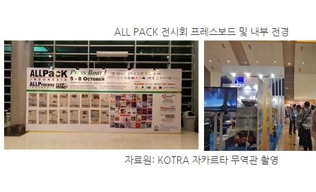 - 아시아 최대 규모 포장기계 전시회, 올해로 17회를 맞아 -- 25개국 이상에서 750개의 기업 참여, 중국계 기업 참여 많아 –- 최근 한국 제품의 해외생산에 따른 품질 저하 우려 표시하기도 - □ 개요 ㅇ 매년 개최되고 있는 'ALL PACK Indonesia'는 아시아 최대 규모 포장기계 전시회로, 2016년에는 한국·중국·미국·프랑스·스페인·인도 등 25개국 이상에서 750개 업체가 참여함. ㅇ 행사장에서는 아세안 최대 시장인 인도네시아 내수시장을 선점하려는 외국기업의 치열한 마케팅 경쟁이 벌어짐. 특히 중국과 대만계 기업들의 참여가 두드러졌는데, 이는 가격을 중시하는 인도네시아 포장기계 업계의 특성을 반영 ㅇ 현장에서 만난 인도네시아 바이어들은 한국 제품의 우수한 품질과 개선된 가격경쟁력에 높은 만족감을 표시함. 하지만 일부 바이어는 최근에 중국 등 타국에서 생산된 한국 제품의 품질이 예전 같지 못하다는 의견을 나타냄. □ All Pack Indonesia – 아시아 최대 규모 포장기계 전시회 ㅇ ALL PACK Indonesia는 아시아에서 가장 규모가 큰 포장기계 전시회로, 매년 열리고 있으며 올해로 17회를 맞이했음. 2015년에는 24개국에서 총 748개 업체가 참여했으며, 이번 2016년 전시회에는 총 25개국 이상이 참여했음. 특히 중국이 4개의 에이전트 업체로부터 매우 큰 규모로 참가했으며, 아시아 국가 이외에도 미국, 프랑스, 스페인, 인도 등 여러 국가에서 약 750개 업체가 참여함. All Pack Indonesia 2016 전시회 기본정보 전시회명 ALL PACK INDONESIA 2016 개최기간 2016.10.5(수)~10.8(토) 홈페이지http://allpack-indonesia.com/ 개최장소 자카르타 국제 엑스포(JI EXPO, Kemayoran, Jakarta) 참가업체 총 743개 업체 전시분야 가공, 포장, 필링, 정비, 자동화, 프린팅 및 라벨링 등 기기 전시 주최기관 Krista Exhibitions 주최기관 연락처 +62 21 6345861, info@kristamedia.com 자료원: Krista Exhibition ㅇ 크게 식품, 음료, 제약, 화장품의 4개 분야 제조 및 포장 기기가 전시됐으며, 1차 포장 이외에도 2차 포장기계 및 운반과 품질 검사기기 등 다양한 기기가 전시됨. 이 외에 관련 세미나도 함께 진행됨. 의사결정권 기준 방문자 비율단독 의사결정자 57.3% 일반 의사결정자 18.6% 고문 16.9% 그 외 7.2% 합계 100% 직위별 방문자 비율총괄 경영 65.3% 최고경영진 21.9% 판매 마케팅 9.6% 홍보, 구매 및 연구개발 3.3% 합계 100% 자료원: ALL PACK INDONESIA 홈페이지 ㅇ 작년 전시회 방문자 수는 약 2만4000명이었으며, 이번 전시회 또한 비슷한 인원이 방문할 것으로 예상하고 있음. 주최 측에 따르면, 작년 ALL PACK 포장기계전의 방문자 중 65.3%가 총괄 경영직으로 가장 큰 비율을 차지했으며, 또한 방문자의 57.3%가 단독 의사결정권자인 것으로 나타남. □ 우리 기업 참가 큰 폭으로 늘어난 한국관 ㅇ 이번 All PACK 포장기계전의 한국관에서는 총 13개 업체가 전시를 진행함. 연질 및 경질포장재, 라벨링 및 프린팅 기기, 품질 검사기기, 진공 포장기, 2차 포장기, 전동문, 펌프 및 실링기 등 다양한 종류의 기기가 전시됐음. 한편, 작년 16개 스탠드에서 올해는 22개 스탠드 확보로 한국관의 규모가 큰 폭으로 확대됨. ㅇ All Pack Indonesia는 한국관(Korea Pavilion)을 포함해 중국, 대만, 프랑스 등의 해외 국가관들이 참가해 치열한 마케팅 경쟁을 벌임. 한국관에 입점한 몇몇 기업은 전시회장 내에서 판매 계약이 체결되는 성과를 올리기도 했으며, 인도네시아 현지 에이전트 업체를 통하거나 개별적으로 전시회에 진출한 한국 기업들 또한 있었음. □ 한국 제품의 해외 생산으로 인한 품질 저하 우려 지적 ㅇ 인도네시아 최대 산업 부품 유통업체인 Kawan Lama(카완라마)사에서는 이번 전시회에서 여러 측정 및 계량 기기를 전시했음. 판매부서장 Abid에 따르면, 주로 일본, 덴마크 등에서 물품을 구매하고 있으며 현재 한국 제품은 저울 1종이 판매되고 있다고 함. 한국 제품에 대한 장점에 대해서는 품질이 좋아 주로 판매 후 컴플레인이 적은 편이라고 언급함. ㅇ 또한, 한국 제품의 가격에 대해서도 긍정적인 입장을 보임. 이는 해상 운송을 통한 배송비 부담이 줄어들었기 때문이며, 이로 인해 한국 제품 판매 시에 여전히 중국 등 다른 해외 제조사 물품에 비해 가격경쟁력이 있다고 언급함. ㅇ 한편, 인도네시아 현지의 상업용 냉동장비 및 주방설비 판매업체인 PT. Royal Sutan Agung사의 Monica에 따르면, 제품의 좋은 품질 외에 원활한 A/S도 중요한다고 함. 본 업체에서는 한국, 중국, 태국, 스페인 등지에서 물품을 구매하고 있는데, 다양한 제품에 적합한 A/S 제공을 위해 전담 부서를 두고 있으며, 제품 구매 시 기술 전수를 통해 A/S를 제공한다고 함. - 또한, 높은 단가로 인한 낮은 가격경쟁력을 한국 제품의 아쉬운 점으로 꼽았음. 뿐만 아니라, 구매에 있어 브랜드 외에도 제품이 생산된 국가가 중요하다고 언급함. 노동비 절감 등을 위해 중국 및 동남아 등지로 생산설비를 이전하는 회사가 많아진 이후, 물품의 단가가 낮아진 점은 만족스러우나 품질이 하락한 느낌이 있다고 언급함. □ 참가 관련 정보 ㅇ 참여를 원하는 기업 및 방문객은 공식 홈페이지(http://allpack-indonesia.com/)에서 온라인 및 모바일로 신청이 가능하며, 방문객의 경우 현장 접수 