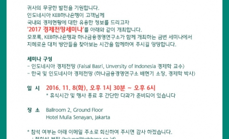일시 : 2016년 11월 8일(화), 오후 1시 30분 ~ 오후 6시 장소 : Ballroom 2, Ground Floor, Hotel Mulia Senayan, Jakarta * 참석 회신 : 정희상 부장(hsjung@kebhana.co.id)