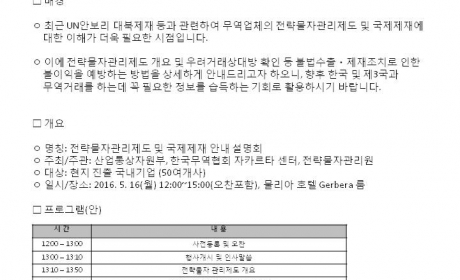 안녕하십니까, 한국무역협회 자카르타 센터입니다.오는 16일 '전략물자관리제도 및 국제제재'를 주제로 한 설명회가 개최되오니, 많은 참석 부탁드립니다. <행사개요>- 일 시: 2016년 5월 16일(월) - 시 간: 12:00~15:00(오찬포함)- 장 소: Hotel Mulia Gerbera room- 주 관: 산업통상자원부 한국무역협회 자카르타센터 전략물자관리원*참석자 수에 제한(50명 마감)이 있사오니, 참가를 원하시는 분은 성함, 직함, 소속, 핸드폰, 이메일을 기재하여 kitajkt@kita.net 또 는 021-5140-1150~1151로 회신 주십시오. 감사합니다.