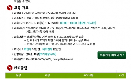 o 중소ㆍ중견 등 자체 교육이 어려운 기업을 대상, 해외주재원에 대한 교육을 제공하여 성공적인 현지 적응과 조기 업무 투입을 지원하여 기업 경쟁력 제고 지원o 인도네시아 시장진출과 관련된 핵심분야의 실무를 파견 전 숙지하여 시행착오를 최소화 할 수 있다.o 인도네시아 사업시 일어날 수 있는 리스크 요인을 분석하여 기업차원의 대처능력과 대응방안을 학습할 수 있다.대ㆍ중소기업 인도네시아 해외파견 예정자, 인도네시아 비즈니스에 관심있는 CEO 및 임직원 등 50명 내외 출석율80% 이상시 수료