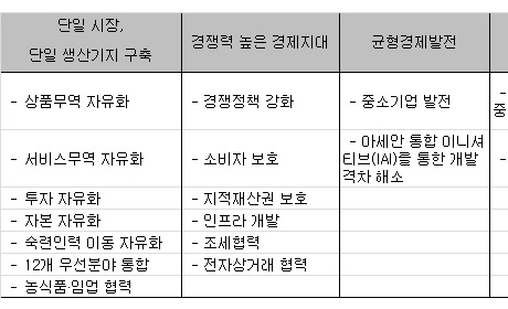 □ 개요 ○ 2015년 말, 아세안 경제공동체(AEC) 출범 이후에도 AEC 통합과정은 아직 진행 중이며, 새로운 통합 계획인 'AEC Blueprint 2025'에 따라서 2025년까지 지속될 예정임. ○ AEC는 2조6000억 달러에 달하는 세계 7위의 거대 경제권인 점과 한국의 주요 경제파트너인 점에서 AEC 통합에 따른 시장변화에도 우리 기업의 관심이 모이고 있음. ○ AEC 역내 무역비용 감소와 생산기지 집중화 현상 등으로 향후 우리 기업이 강점을 갖는 부품산업이나 전자상거래 등의 유통/물류산업 현지 진출이 유망할 것으로 보임. □ 아세안 경제공동체 출범 및 진행 현황 ○ 아세안(ASEAN, Association of South-East Asian Nations)은 동남아 국가 간 전반적인 상호협력을 증진하기 위해 창설된 기구로, 1967년 5개국으로 시작된 이후 1999년에 마지막으로 가입한 캄보디아까지 총 10개국이 회원임. 아세안을 대표하는 기구인 아세안 사무국(ASEAN Secretariat)은 1976년도에 설립됐으며 인도네시아 자카르타에 있음. ○ 아세안 참여국들은 회원국 간의 협력체계를 더욱 발전시키기 위해 2015년 12월 31일에 아세안 공동체(ASEAN Community)를 새롭게 출범시킴. 아세안 공동체는 정치 안보 공동체(Political-Security Community), 경제 공동체(Economic Community), 사회 문화 공동체(Socio-Cultural Community)로 구분되며, 이 중에서도 파급효과 측면에서 경제공동체(AEC)가 가장 주목을 받고 있음. ○ AEC 통합은 첫 번째 계획인 'Blueprint 2015'에 따라 4개의 영역으로 구분해 추진돼 옴. 교역 자유화를 중심으로 참여국들의 경쟁력 제고, 역내 균형 발전 등이 주요 내용이며, 2015년 말 아세안 공동체 출범으로 이 계획은 일단락됨. 아세안 경제공동체 추진 계획(Blueprint 2015)자료원: 아세안사무국(ASEAN Secretariat) 홈페이지 ○ 이 추진 계획은 506개의 세부 조치들로 이뤄져 있으며, 2015년 10월 기준 469개가 이행돼 92.7%의 진척도를 보였음. 4대 영역별 진척도는 아래 표와 같음. 예를 들어 관세의 경우, 아세안 선발 6개국 간의 관세율은 거의 0%에 이르고 있으며, 이외 발전 단계가 뒤처진 CLMV(캄보디아, 라오스, 미얀마, 베트남) 국가의 경우도 약 2.5% 수준으로 낮춰짐. 아세안 경제공동체 1차 추진 계획 달성 현황자료원: 아세안사무국(ASEAN Secretariat) 홈페이지 ○ 아세안은 2025년까지 수행되는 두 번째 추진 계획인 'AEC Blueprint 2025'를 발표함. 이 계획은 5개의 분야로 나눠지며, ① 고도로 통합되고 응집된 경제, ② 경쟁력 있고 혁신적이며 역동적인 아세안, ③ 연계성 제고와 부문 간 협력 ④ 복원적, 포용적, 사람 지향, 사람 중심의 아세안, 그리고 ⑤ 글로벌 아세안임. 두 번째 계획이 발표됐지만, 2016년 말까지는 앞선 계획에서 완수하지 못한 것들을 마무리하는 것이 우선순위임. □ 아세안 경제공동체의 중요성 ○ AEC가 주목받는 이유는 빠르게 성장하고 있는 거대 경제권이기 때문. 아세안 10개국을 합한 GDP 규모로 보았을 때 세계 7위에 해당하는 2조6000억 달러 규모이며, 이는 2007년과 비교 시 2배 가까이 증가한 수치임. 1인당 GDP 역시 76% 성장함. ○ 무역 규모로 본 AEC는 수입 3위(12억 달러), 수출 4위(13억 달러) ○ 외국인 투자(FDI)는 2014년 기준으로 1360억 달러로 2007년 대비 60% 성장했으며, 전 세계에서 차지하는 비중도 5%에서 11%로 큰 폭으로 확대됨. 또한, 역내 투자 금액이 240억 달러로 유럽에 이어 두 번째로 큼. 아세안경제공동체 무역규모, 주요 교역국, 외국인 투자 현황(2014년 기준) 무역규모, 주요 교역국 현황외국인 투자 현황 자료원: 아세안사무국(ASEAN Secretariat) 홈페이지 ○ 아세안은 한국과의 교역량에서도 수출, 수입이 전체 교역국 중 3위~4위에 달하는 주요 교역대상. 한국의 대아세안 무역수지 흑자도 2007년 56억 달러에서 2014년 312억 달러로 5배가 넘게 증가함. 한국과 아세안의 경제협력 현황 (단위: 억 달러, %)자료원: 한눈에 보는 AEC(대한민국 아세안대표부) □ 아세안 경제공동체 출범으로 인한 변화 ○ FTA 허브로서의 입지 강화: 아세안은 현재 한국·중국·일본·인도·호주-뉴질랜드와 5개의 FTA를 체결 중이며, AEC 출범으로 역내 경제통합이 강화될 경우 FTA 허브로서의 입지가 견고해질 것으로 보임. 최근에 추진되고 있는 RCEP(역내 포괄적 경제동반자 협정)도 이러한 움직임과 동일선상에 있음. ○ 아세안 국가 간의 역내 분업 심화: 관세 축소로 무역비용이 축소되고, 각 공정별로 비교우위가 있는 곳에 생산공장을 짓게 됨. 이와 같이 전체 제품생산 공정이 지역별로 분리되면서 역내무역은 더욱 증가하고 복잡해질 것으로 보임. ○ 생산의 집중화: 무역비용의 축소로 판매 시장을 중심으로 한 생산설비보다는 경쟁력 있는 입지조건을 갖는 지역으로 생산설비를 집중할 가능성이 커짐. ○ 국가 간 경쟁 심화: 참여국들의 '입지 경쟁력'을 둘러싼 경쟁이 심화될 것으로 보임. 저렴한 노동력, 양호한 인프라, 부품 및 중간재 확보 용이성, 조세 정책 등이 대표적인 경쟁력 요소들이며, 인프라를 개선하기 위한 투자 확대, 새로운 산업공단 건설을 통한 입지 문제 해결 노력 등이 국가별로 나타나고 있음. □ 유망 산업 분야: 부품산업과 유통/물류산업 ○ 부품산업: 역내 분업 심화로 생산기지가 집중되는 지역에 조립