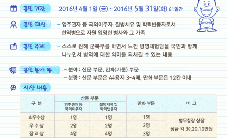 병무청은 “병역이행 자진풍토 조성과 병역이 자랑스러운 세상 만들기”를 위하여 영주권자 등 자원병역이행자의 병영생활 체험수기를 아래와 같이 공모하고 있는바, 영주권 병사로 자원 입영하여 군복무 중이거나 전역한 사람 또는 그 가족의 많은 참여바랍니다. 1. 공모기간 : 2016년4월1일 ~ 2016년5월31일 (61일간) 2. 공모대상 : 영주권자 등 국외이주자, 질병치유 및 학력변동자로서 현역병으로 자원 입영한 병사와 그 가족 3. 공모주제 : 스스로 느낀 병역체험담을 국민과 함께 나누면서 병역에 대한 의미를 되새길 수 있는 내용 4. 공모분야 및 분량 - 분야 : 산문부문, 만화(카툰) 부문 - 분량 : 산문부문은 A4 용지 3~4매, 만화부문은 12칸 이내 5. 시상내용 및 응모방법 등은 붙임 파일을 참고하시기 바랍니다.