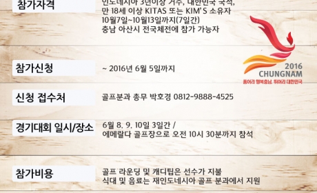 가. 참가자격 : 볼링과 동일 나. 참가신청 : 2016년 6월 5일까지 다. 신청 접수처 : 골프분과 총무 박호경 0812-9888-4525 라. 경기대회 일시/장소 : 6월 8. 9. 10일 3일간 / 에메랄다 골프장으로 오전 10시 30분까지 참석 마. 참가비용 : 골프 라운딩 및 캐디팁은 선수가 지불 식대 및 음료는 재인도네시아 골프 분과에서 지원 바. 자격 및 선발 인원 : 3회의 라운딩을 거쳐서 남자 2명, 여자 2명의 선수를 선발 사. 문의 사항 : 골프분과 총무 박호경 0812-9888-4525 재인도네시아 골프분과 회장 한현봉